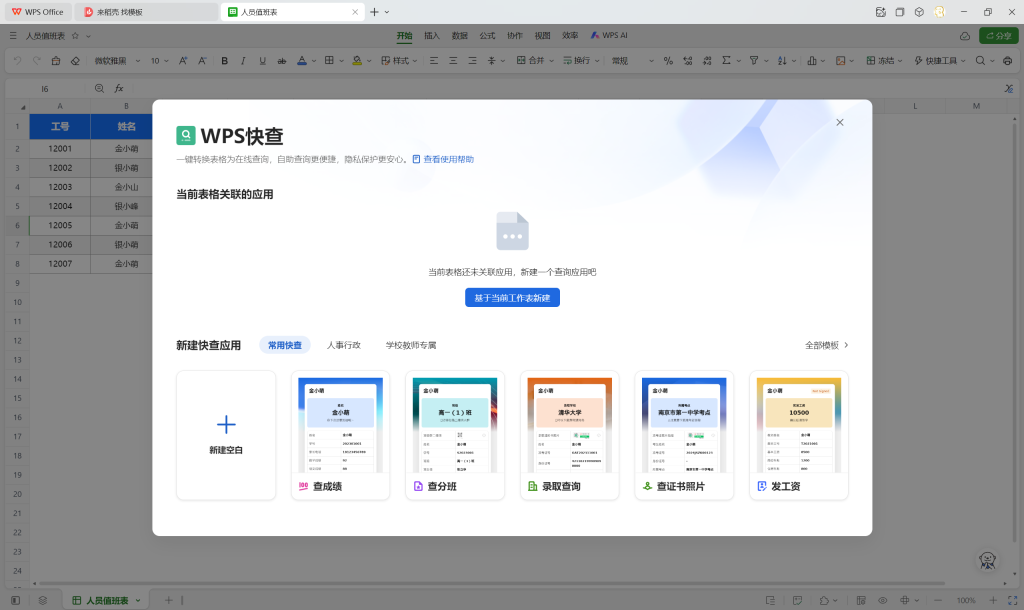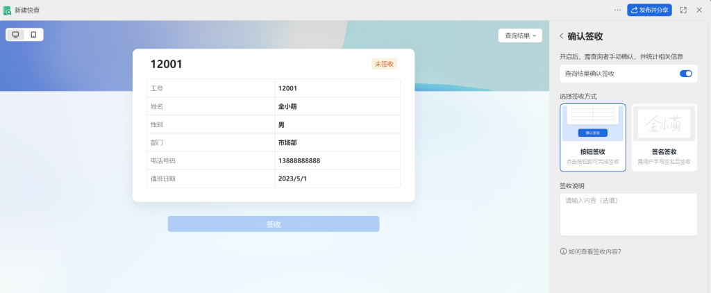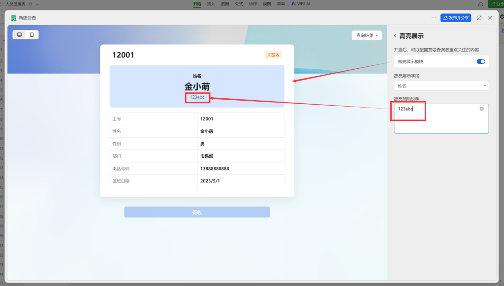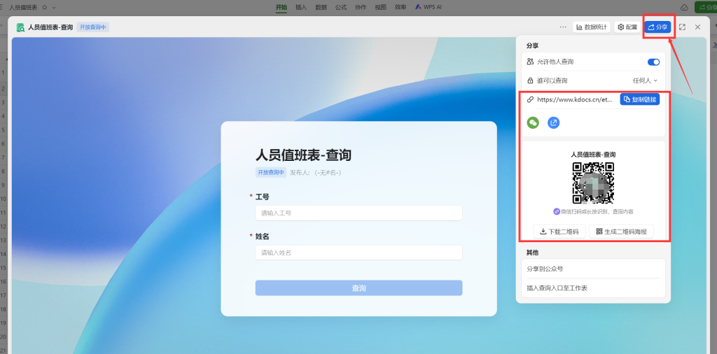 此处我们可以给这个查询表命名,修改需要输入的内容(WPS功能较简单,目前无法实现逻辑判断),如果开启数据同步,修改表格后这个查询会同步进行。(建议发布人关闭,或者不使用网名。有效期按需修改,公告同理)。