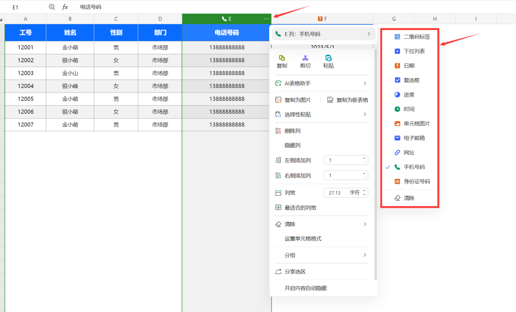 我们需要先写一个表头,把需要的信息写出来,此时有个比较重要的设置,就是把日期、电话号、身份证号等信息进行特殊标注,以便收集表和查询的设置。